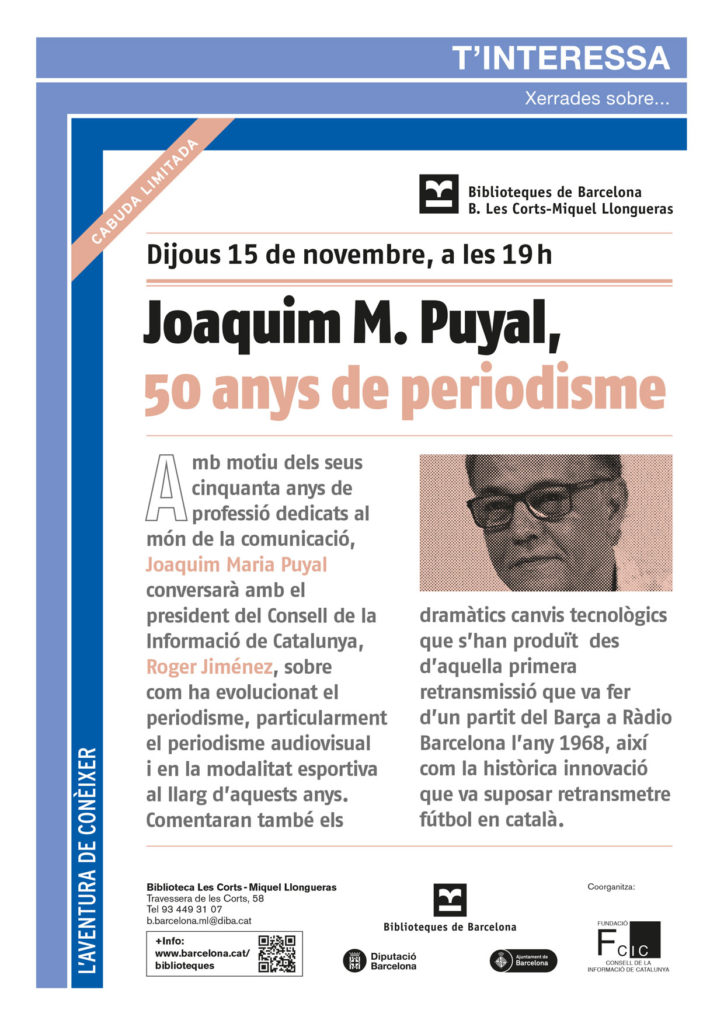 Amb motiu dels seus cinquanta anys de professió dedicats al món de la comunicació, Joaquim Maria Puyal conversarà amb el president del Consell de la Informació de Catalunya, Roger Jiménez, sobre com ha evolucionat el periodisme, particularment el periodisme audiovisual i en la modalitat esportiva al llarg d’aquests anys. Comentaran també els dramàtics canvis tecnològics que s’han produït des d’aquella primera retransmissió que va fer d’un partit del Barça a Ràdio Barcelona l’any 1968, així com la històrica innovació que va suposar retransmetre fútbol en català.