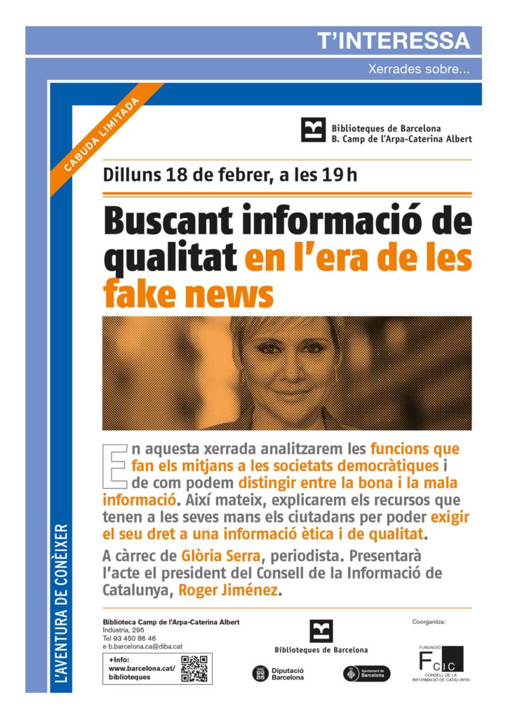 El proper mes de febrer, el dilluns 18 a les 19 hores ens acompanyarà la periodista Glòria Serra, directora i presentadora del programa Equipo de Investigación de la Sexta, la qual analitzarà com en els mitjans de comunicació actuals es pot buscar informació de qualitat davant l’era de les fake news.