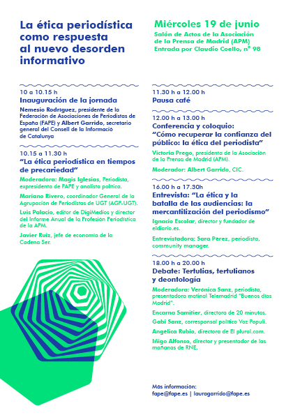 El pasado miércoles día 19 de junio, el Consell de la Informació de Catalunya (CIC) y la Federación de Asociaciones de Periodistas de España (FAPE) organizaron la jornada “La ética periodística como respuesta al nuevo desorden informativo”, que tuvo lugar en el Salón de Actos de la Asociación de la Prensa de Madrid”