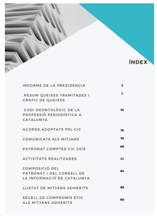 El 2019 ha estat un exercici carregat d’activitat i on el Consell de la Informació de Catalunya ha fet un pas endavant en sintonia amb la societat civil i el públic en general. D’una banda, les jornades organitzades pel CIC al llarg de l’any en col·laboració amb el Col.legi de Periodistes, la Universitat Autònoma i la Federación de Periodistas de España (FAPE) han comptat amb una audiència diversa i molt orientada vers l’examen de la pràctica deontològica als mitjans de comunicació i els objectius proposats pels diferents ponents. D’altra banda, el nombre de queixes i els punts del Codi esgrimits fan pensar en un augment de l’exigència a la nostra societat d’una premsa independent+, acurada i de qualitat, com espot constatar amb la lectura detallada de les reclamacions rebudes.