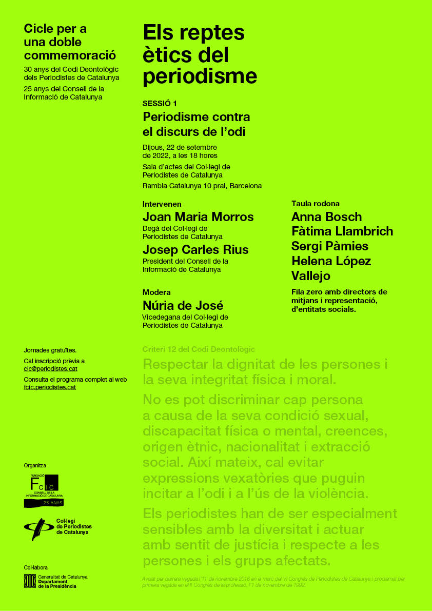 La primera sessió se celebra el proper dijous, 22 de setembre a la sala d’actes del Col·legi de Periodistes de Catalunya. Porta per títol ‘Periodisme contra el discurs d’odi’ i l’objectiu és reflexionar sobre la necessitat, com diu el criteri 12 del codi deontològic, de “respectar la dignitat de les persones i la seva integritat física i moral: No es pot discriminar cap persona a causa de la seva condició sexual, discapacitat física o mental, creences, origen ètnic, nacionalitat i extracció social. Així mateix, cal evitar expressions vexatòries que puguin incitar a l’odi i a l’ús de la violència. Els periodistes han de ser especialment sensibles amb la diversitat i actuar amb sentit de justícia i respecte a les persones i els grups afectats”.