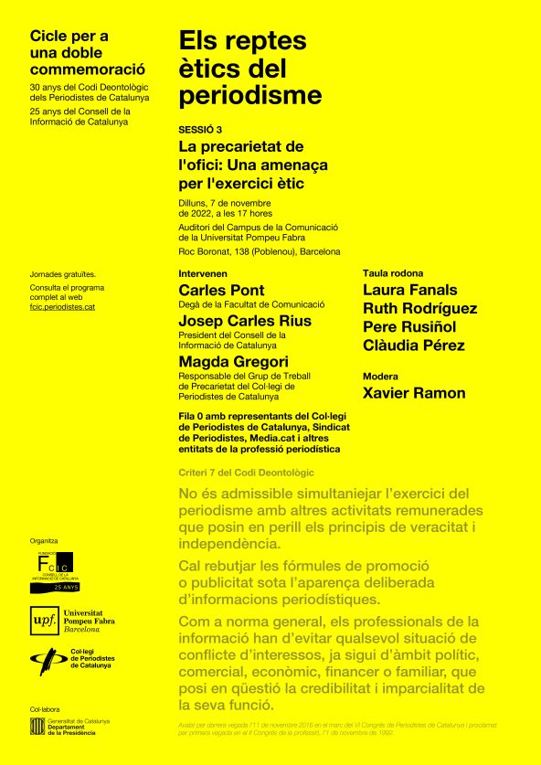 En aquesta sessió, la tercera que organitza el Consell de la Informació de Catalunya amb el Col.legi de periodistes i universitats amb estudis de periodisme, experts en el tema, com Laura Fanals, Ruth Rodríguez i Xavier Ramon juntament amb el director de la revista Alternativas Ecónomicas, Pere Rusiñol, debatran el proper dilluns, 7 de novembre a les 17 hores, sobre la precarietat laboral en la que molts periodistes han d’exercir actualment la professió, dificultant-los el compromís amb els valors ètics que exigeix el nostre ofici.