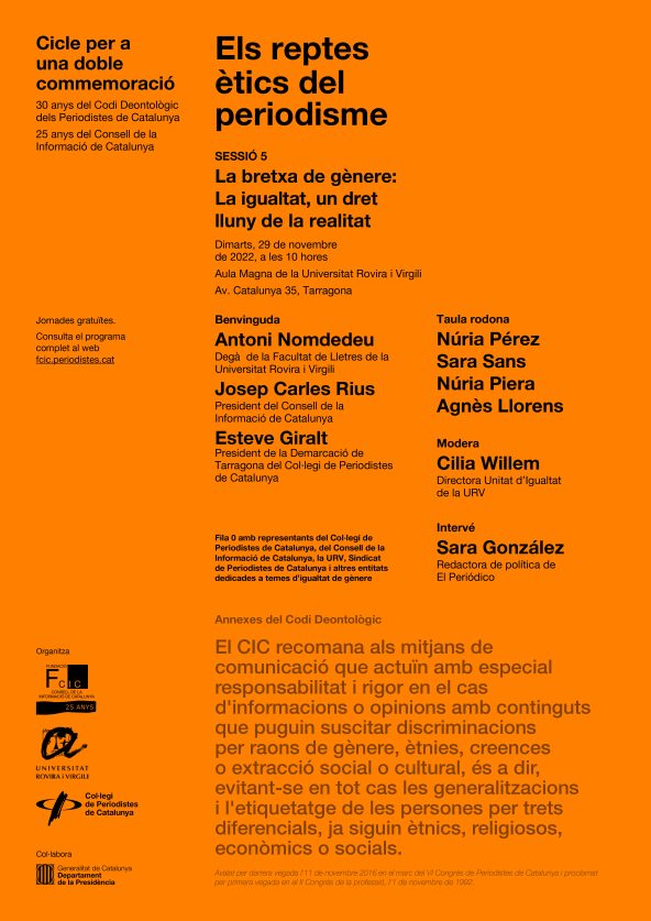 El Consell de la Informació de Catalunya, la Universitat Rovira i Virgili i el Col.legi de Periodistes organitzen la cinquena de les sis jornades sota el títol “La bretxa de gènere: La igualtat pendent, un dret lluny de la realitat”.
