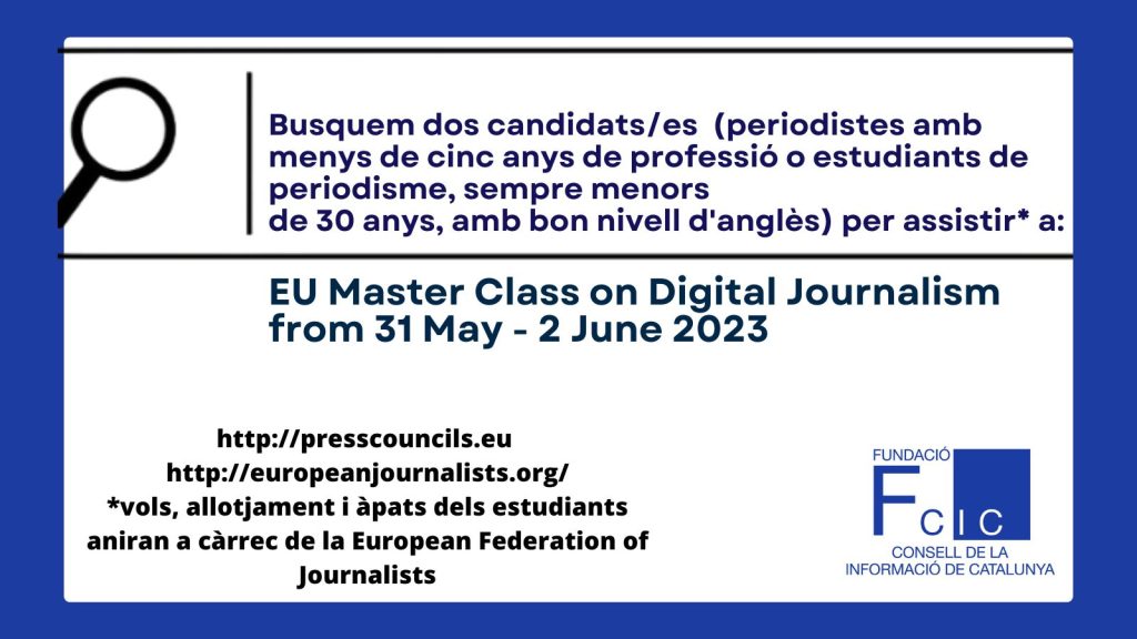 𝗕𝗨𝗦𝗤𝗨𝗘𝗠: 2 candidats/es (periodistes amb menys de 5 anys de professió o estudiants de periodisme, menors de 30 anys, amb bon nivell d’anglès.