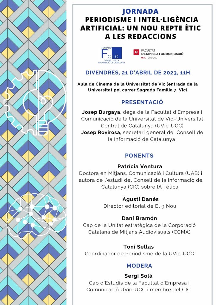 L’obertura de l’acte anirà a càrrec del degà de la Facultat d’Empresa i Comunicació de la UVic-UCC, Josep Burgaya. El secretari General del CIC, Josep Rovirosa, farà una breu introducció per explicar la funció del Consell de la Informació i donarà pas a la taula rodona que moderarà el Cap d’Estudis de la Facultat i Conseller del CIC, Sergi Solà. Intervindran com a ponents Toni Sellas, coordinador del Grau de Periodisme de la Facultat; Agustí Danés, Director editorial de El 9 Nou; Dani Bramón, Cap de la Unitat estratègica de la CCMA, i Patrícia Ventura, doctora en Mitjans, Comunicació i Cultura per la UAB i autora de l’estudi publicat pel CIC sobre IA i ètica.