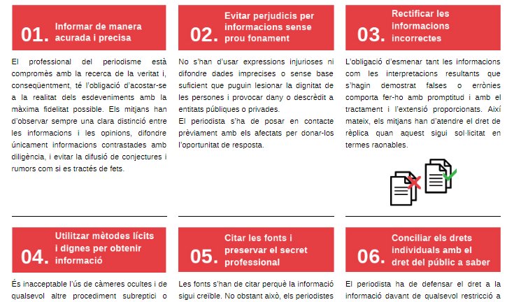 “El professional del periodisme està compromès amb la recerca de la veritat i, conseqüentment té l’obligació d’acostar-se a la realitat dels esdeveniments amb la màxima fidelitat possible. Els mitjans han d’observar sempre una clara distinció entre les informacions i les opinions, difondre únicament informacions contrastades amb diligència, i evitar la difusió de conjectures i rumors com si es tractés de fets.”