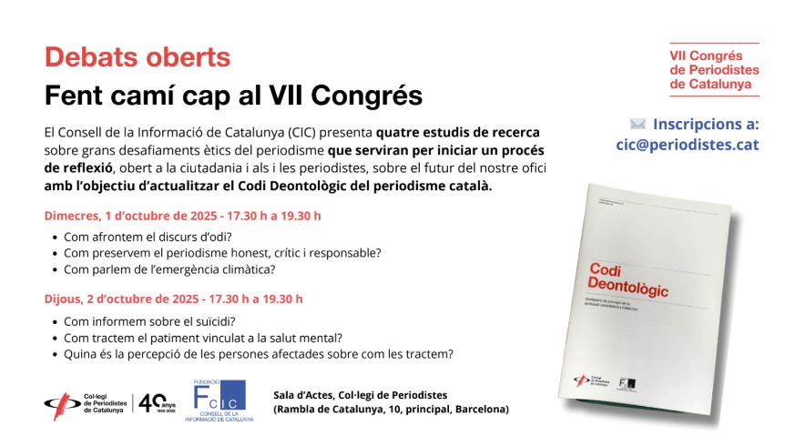 El Consell de la informació de Catalunya (CIC) presentarà els propers dies 1 i 2 d’octubre de 2025 a les 17,30h. quatre estudis de recerca sobre desafiaments claus del nostre ofici que serviran per iniciar un procés de reflexió, obert a la ciutadania i als i les periodistes, sobre el futur del nostre ofici, amb l’objectiu d’actualitzar el Codi Deontològic del periodisme català.