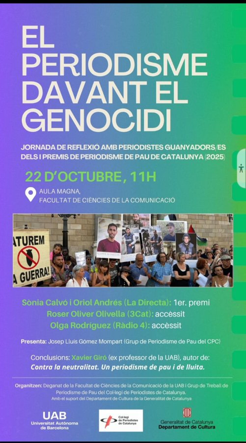La jornada, sota el títol El periodisme davant del genocidi, busca “impulsar la reflexió sobre el periodisme amb visió de pau i resolució de conflictes dins de l’àmbit universitari”, com remarca el Col·legi. Així mateix, les ponències busquen estendre l’impacte dels guardons, fomentant el debat entre la comunitat estudiantial sobre com informar de manera responsable i constructiva.
