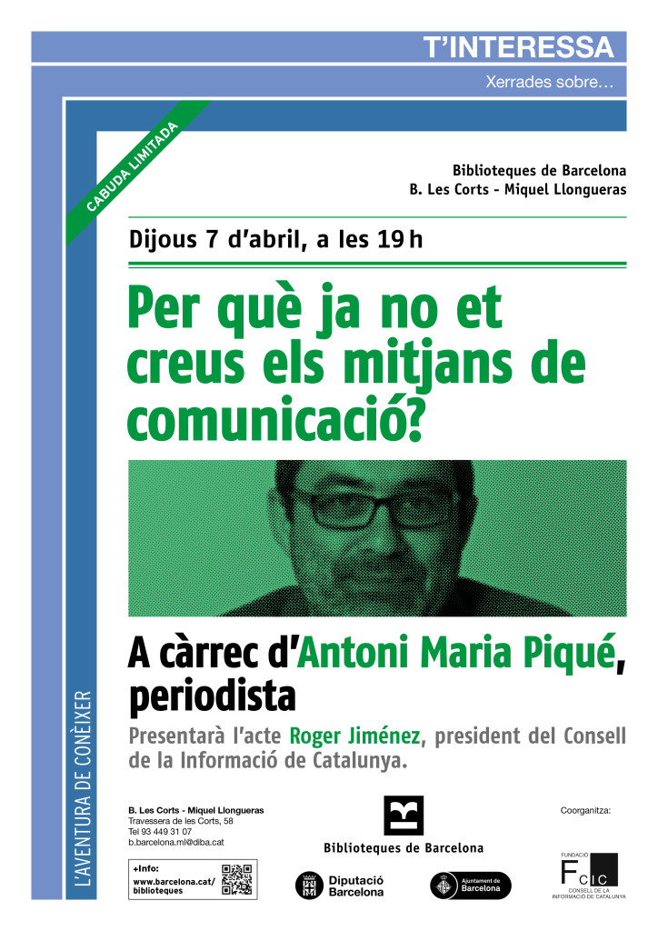 El periodista Toni Piqué analizará el próximo día 7 de’abril en la Biblioteca Les Corts-Miquel Llongueras, a partir de su trayectoria profesional, como ha ido evolucionando el periodismo en la nueva era digital. Acompañado por el presidente del Consejo de la Información de Cataluña, Roger Jiménez, profundizarán en los motivos por los que la ciudadanía se ha vuelto desconfiada de los medios de comunicación, en un momento en el que debería prevalecer la calidad informativa por encima de otros intereses a fin de mantener la aceptación de los lectores y de la audiencia.