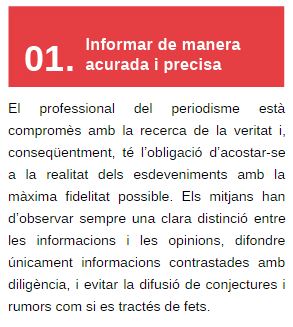 El profesional del periodismo está comprometido con la búsqueda de la verdad y, consecuentemente, tiene la obligación de acercarse a la realidad de los acontecimientos con la máxima fidelidad posible. Los medios deben observar siempre una clara distinción entre las informaciones y las opiniones, difundir únicamente informaciones contrastadas con diligencia, y evitar la difusión de conjeturas y rumores como si se tratara de hechos.