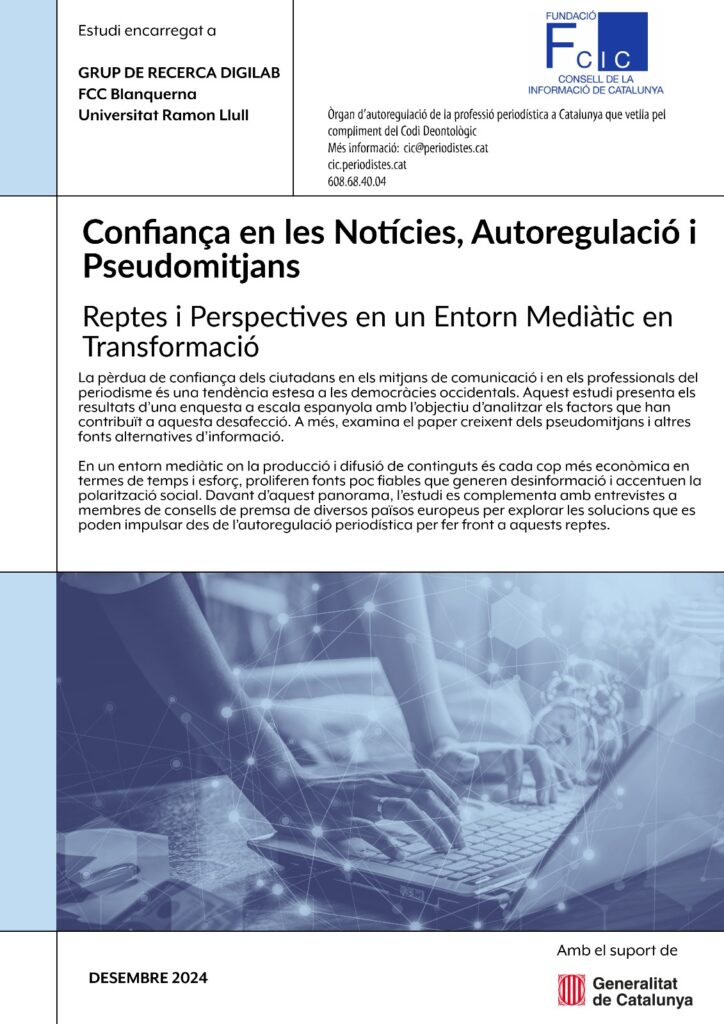 Confiança en les Notícies, Autoregulació i Pseudomitjans. Reptes i Perspectives en un Entorn Mediàtic en Transformació. Des del Consell de la Informació vam encarregar aquest estudi al grup de recerca Digilab, on s’analitzen les causes de la pèrdua de confiança dels ciutadans en els mitjans i periodistes a Espanya, i on també s’examina l’impacte dels pseudomitjans i la desinformació en la polarització social. Finalment, recull propostes d’autoregulació periodística europees per afrontar aquests desafiaments.